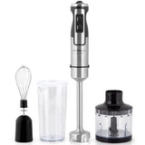 Este modelo incorpora varios accesorios, entre los que encontramos un vaso mezclador de 600 ml, un batidor de alambre y un picador universal de 500 ml. El picador universal ofrece la posibilidad de picar los alimentos a menor número de revoluciones y conseguir un mayor abanico de texturas en los alimentos.