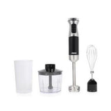Juego de batidora de mano de diseño de alta gama con 1000 W de potencia. El juego incluye un vaso medidor de 700 ml con tapa, una picadora de 500 ml y un batidor de varillas. La batidora de mano tiene varilla de acero inoxidable.
