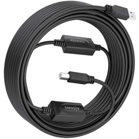 Cable prolongador USB 2.0 con conector tipo A macho en un extremo y tipo B macho en el otro. Lleva doble amplificador para amplificar la señal de USB