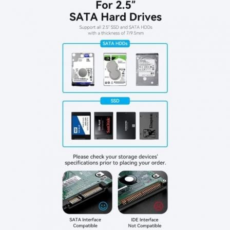 Admite discos duros y SSD SATA de 2,5' y garantiza la compatibilidad con dispositivos que solo tienen interfaz SATA. No es compatible con interfaz IDE.