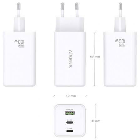 • Name : Cargador de Pared GaN Aisens ASCH-100W3P051-W/ 2xUSB Tipo-C/ 1xUSB/ 100W