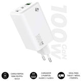Potencia Total en Tamaño Compacto. El nuevo Cargador GaN de 100W SUBBLIM redefine la carga rápida con un diseño compacto, elegante y ultrapotente. Equipado con dos puertos USB-C Power Delivery y un puerto USB-A inteligente, es capaz de cargar simultáneamente hasta 3 dispositivos con una potencia total de 98W, distribuyendo de forma eficiente según las necesidades de cada equipo.