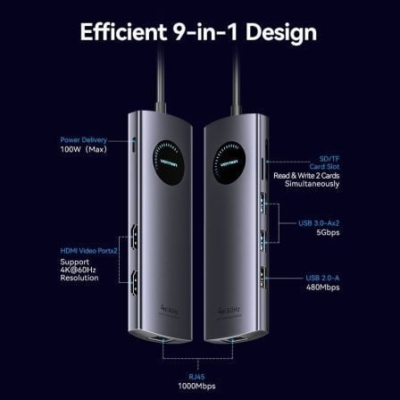 • Conectividad integral 9 en 1:  esta base multifuncional cuenta con una variedad de puertos que incluyen dos salidas HDMI, dos puertos USB 3.0, un puerto USB 2.0, un puerto Ethernet RJ45 para conectividad a Internet por cable, una ranura para tarjeta SD/TF para un fácil acceso a la memoria y un puerto de carga Power Delivery (PD) de 100 W para sus dispositivos.