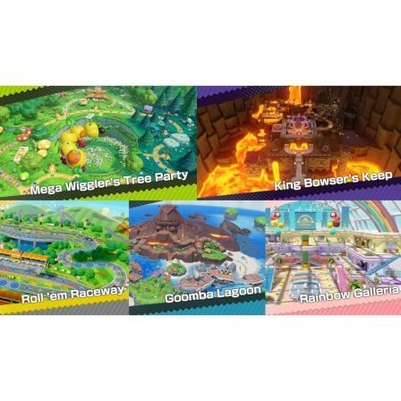 Descubre siete tableros en total: déjate llevar por el flujo de las mareas en la isla Goomba; lánzate a buscar estrellas en las Galerías Arcoíris; regresa a los clásicos entornos del Oeste y el castillo arcoíris de Mario, procedentes de entregas anteriores, ¡y más!