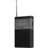 Radio analógica de bolsillo con altavoz, salida para auriculares y antena telescópica.