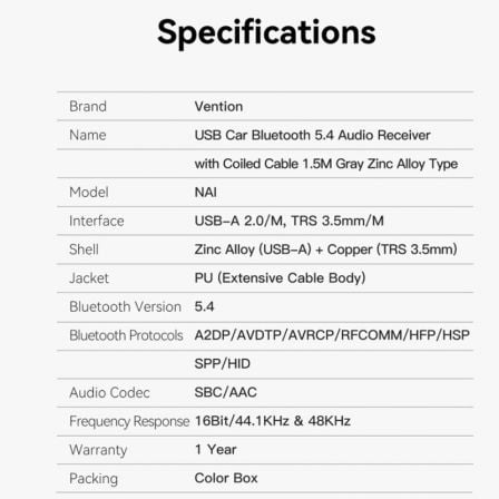 Mejore sin esfuerzo la experiencia de audio de su automóvil con el receptor Bluetooth 5.4 avanzado de Vention. Transforme la forma en que escucha música y se comunica mientras viaja incorporando el receptor de audio Bluetooth 5.4 para automóvil USB de última generación de Vention a su vehículo. Este dispositivo de audio compacto y de diseño elegante está repleto de características impresionantes que están diseñadas específicamente para mejorar su experiencia de viaje diario, así como también los viajes más largos por carretera.