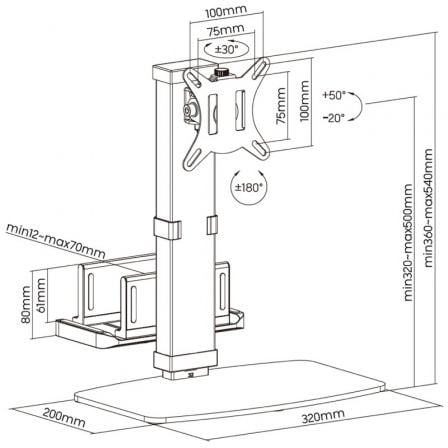 Nota: Este soporte cuenta con un sistema de subida y bajada de tipo carraca. Para subir, simplemente sube el monitor hasta la posición que le guste. Para bajar, hay que subir el monitor hasta la máxima posición, y a continuación, le permitirá bajar el monitor.