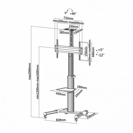Angulo de Inclinación: -12º / +5º. Ángulo máximo de rotación: 0º / +90º (de panorámico a vertical). Altura máxima del soporte: 2069 mm. Rango de ajuste para la altura del soporte TV:1200-1600mm