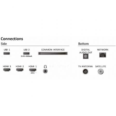 Conectividad: Wi-Fi, 3× HDMI, 2× USB, Ethernet, salida óptica digital, CI+ (Common Interface)